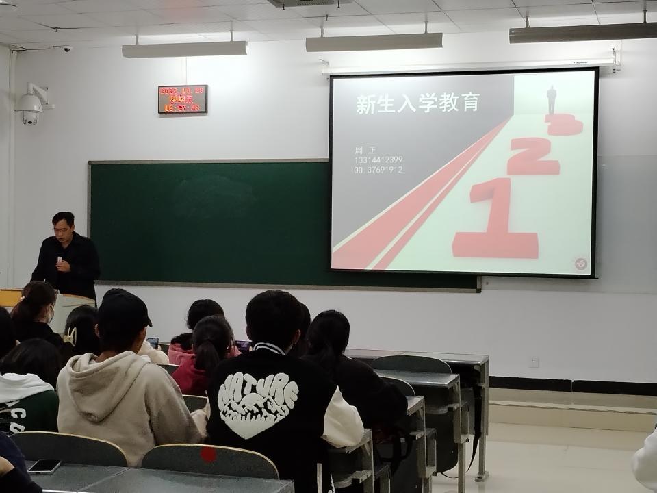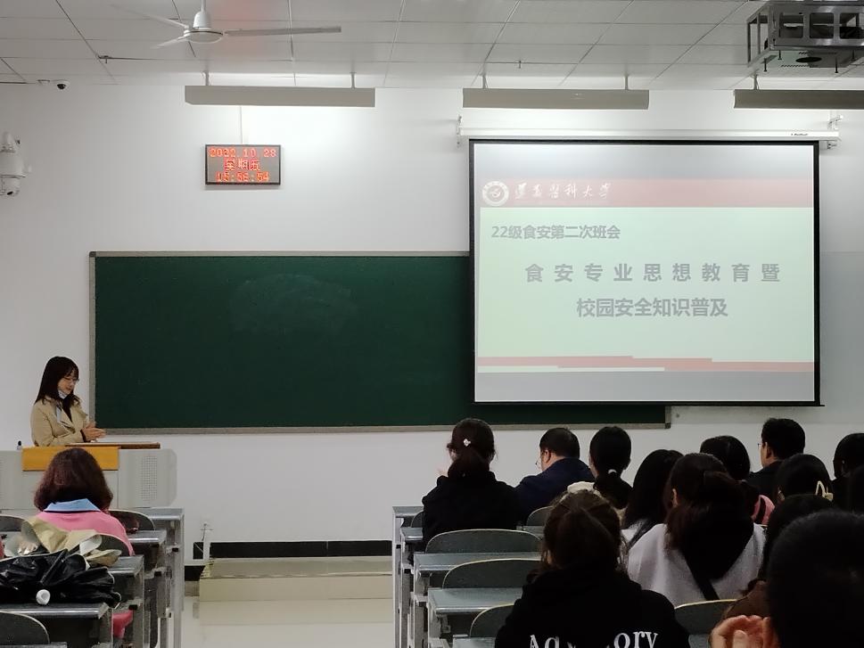 2019级食安的张译文代表高年级同学进行交流发言,分享了她的成长历程。食品安全教研室主任周正博士为2022级食品质量与安全的新同学开展专业思想教育。班主任胡颖老师进行校园安全知识普及,从人身安全、财产安全、生活安全等提了要求。