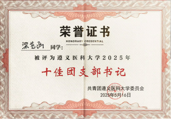 近日,在公司团委组织的“十佳团支部书记”评选活动中,公司预防医学22级1班团支书梁艺函脱颖而出,荣获太阳成集团tyc539“十佳团支部书记”。