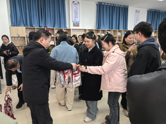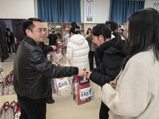 随后,公司领导为考研学子一一送上精心准备的“考研温暖加油包”。礼包外包装印有太阳成集团tyc539院徽与醒目的“高分上岸”祝福语,其中装有暖意融融的暖宝宝、舒缓疲劳的眼罩、随手可捏的解压捏捏乐、公司定制书签、寓意好运的精美挂件、书写顺遂的“上岸笔”、实用笔记本以及老师和学弟学妹们手写的祝福信等多样贴心物品。每一份礼物都凝聚着公司对同学们深切的关怀与真挚的鼓励。接过加油包的学子们倍感温暖,纷纷对公司的悉心安排表达了由衷的感谢。