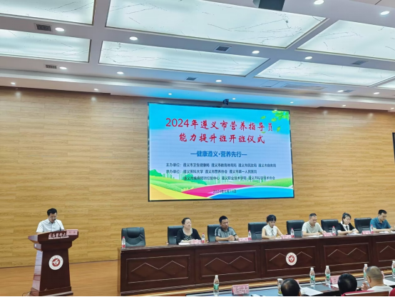 8月15日上午9:00,由公司承办的2024年遵义市营养指导员能力提升班在公司道德讲堂正式开班。遵义市科协副主席孔红、公司副经理(主持工作)周远忠、遵义市卫生健康局食品安全风险监测科科长付薇、遵义市教体局素质教育中心科长王立航、遵义市商务局贸易促进会秘书长李卓、遵义市民政局养老服务与老龄工作科科长段炼、贵州省营养学会副理事长胡斌丽、遵义市营养协会韩华,遵义市健康教育学会会长蔡绍祥、原遵义健康教育所所长闫诚,以及负责本次培训的教师和来自遵义各县(市、区)医疗机构、教体系统、民政养老机构、商业服务机构约300余人参加了开班仪式。公司副经理刘俊主持开班式。